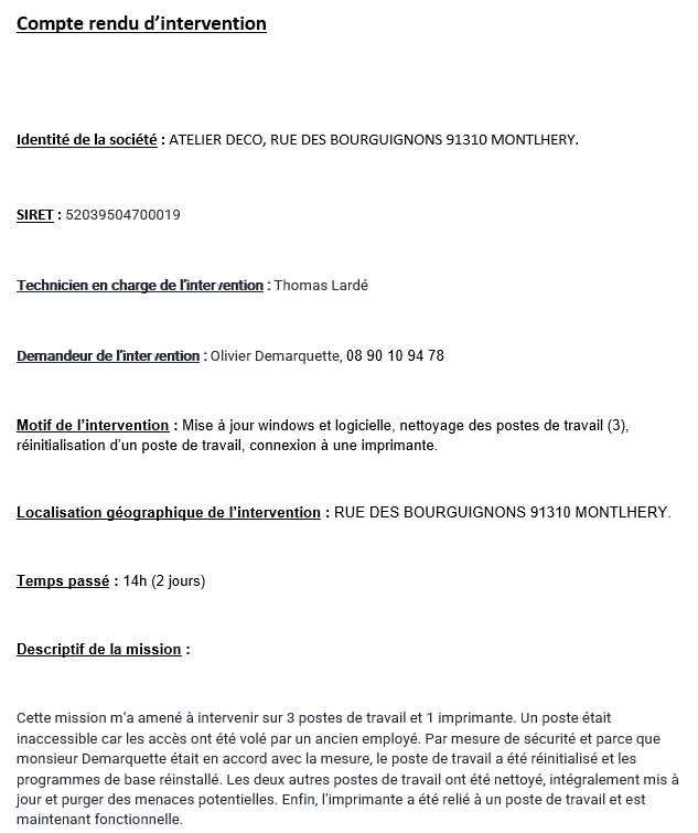 Atelier Deco nous a demandé d'intervenir pour l'entretien et le dépannage de trois postes de travail et d'une imprimante. La mission avait pour durée initale.